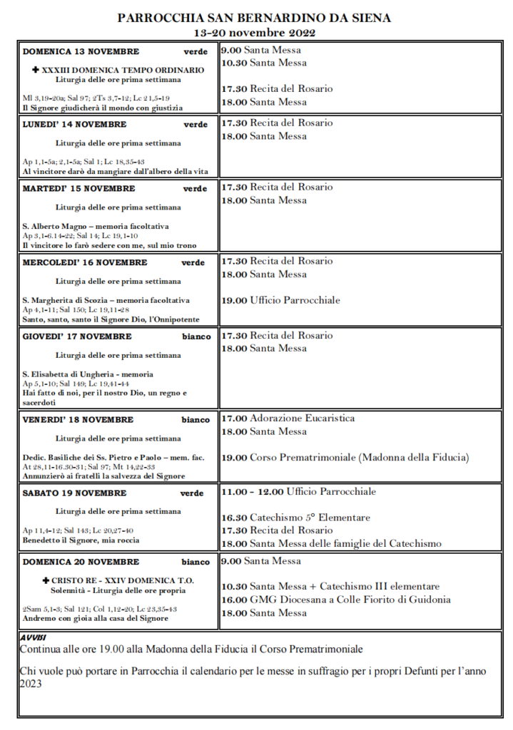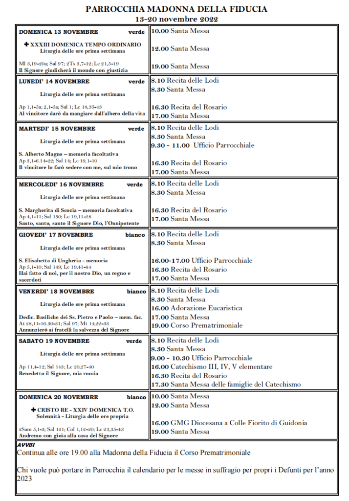 Posted in Calendario Calendario Parrocchiale 13-20 novembre 2022 Author: administrator Published Date: 12 Novembre 2022 Author: administrator